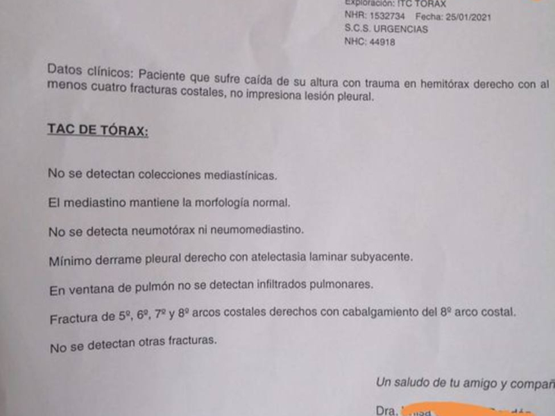 Ya en el hospital, las radiografías se repiten, certificando la rotura de las cuatro costillas, también le hacen un TAC para comprobar que no ha habido daño en los pulmones. Es el relato de los acontecimientos que ha hecho la nieta de esta mujer, contando además la sorpresa de algunos profesionales, acerca de cómo es posible que hasta dos medicos no vieran claramente las lesiones que presentaba. Asegura que va a reclamar con el número de colegiados de los dos sanitarios que atendieron en primer lugar a su familiar.