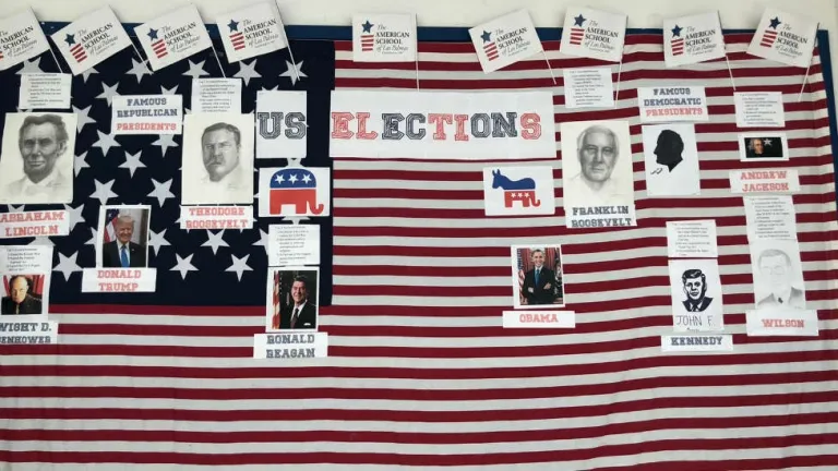 Para la ocasión, el centro también ha querido decorarlo con banderas y dibujos de los alumnos sobre los diferentes presidentes que ha tenido el país norteamericano.