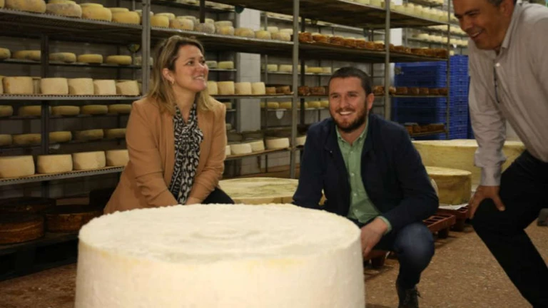 La consejera de Agricultura, Ganadería y Pesca del Gobierno de Canarias, Alicia Vanoostende, ha visitado las instalaciones de la quesería Bolaños (Gran Canaria) junto a uno de sus propietarios, Aarón Hernández, donde se presentó el mayor queso elaborado hasta la fecha por la empresa, con un peso de 213 kilogramos.