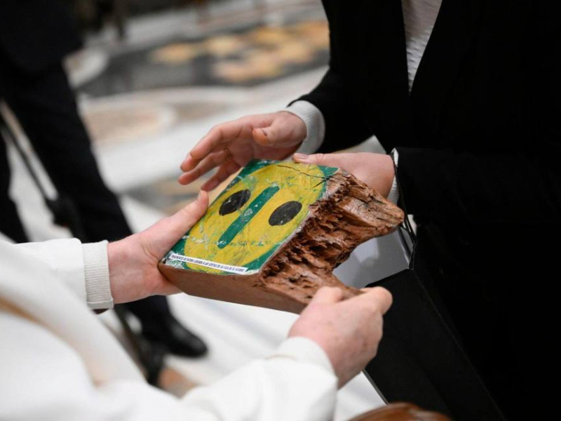 La corresponsal de COPE en el Vaticano, Eva Fernández, entrega a Francisco un fragmento de una embarcación llegada a El Hierro durante 2023
