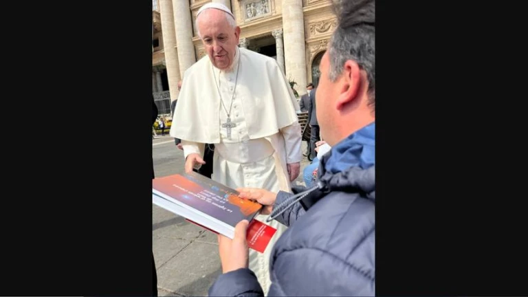 El delegado de Cáritas en Los Llanos de Aridane entrega al Santo Padre un álbum donde se resume el trabajo que se está llevando a cabo en la isla