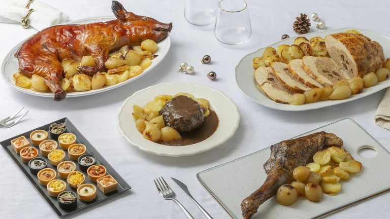 Y como platos principales, se ofrece el pollo de corral deshuesado relleno de chalotas, trufa, foie, ciruelas, brandy y tocino; medio cochinillo asado; paletilla de cordero lechal marinada con sal, romero, tomillo y limón; o bien, la carrillada guisada con salsa de carne y vino tinto. Todos servidos con guarnición de patatas panaderas y cebollitas confitadas, y solo a falta de darle en casa el último punto de horno o microondas.