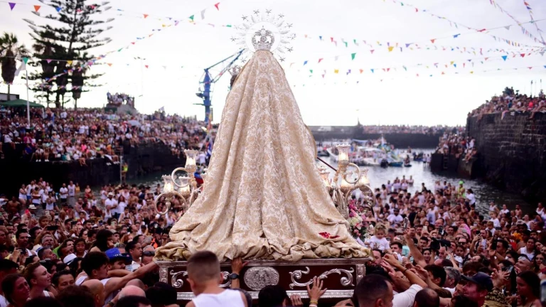 Puerto de la Cruz vive el día más multitudinario de sus Grandes Fiestas de Julio con la Embarcación de la Virgen del Carmen. Entre 30.000 y 35.000 personas se dan cita este martes para vivir uno de los actos populares y religiosos más señeros de Tenerife, con la procesión terrestre y marítima de la alcaldesa honoraria y perpetua de la ciudad.