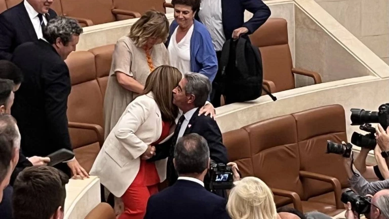 Sin embargo, este no fue el único momento para el recuerdo tras una sesión ya histórica: Buruaga se convirtió en la primera mujer presidenta de Cantabria de la historia. Tras abrazarse con el portavoz popular, el siguiente en la lista era Miguel Ángel Revilla a quien Buruaga fue a dar un abrazo, cosa que el regionalista evitó extendiendo el brazo de inmediato. Apretón de manos entre ambos al que la presidenta añadió un par de besos.