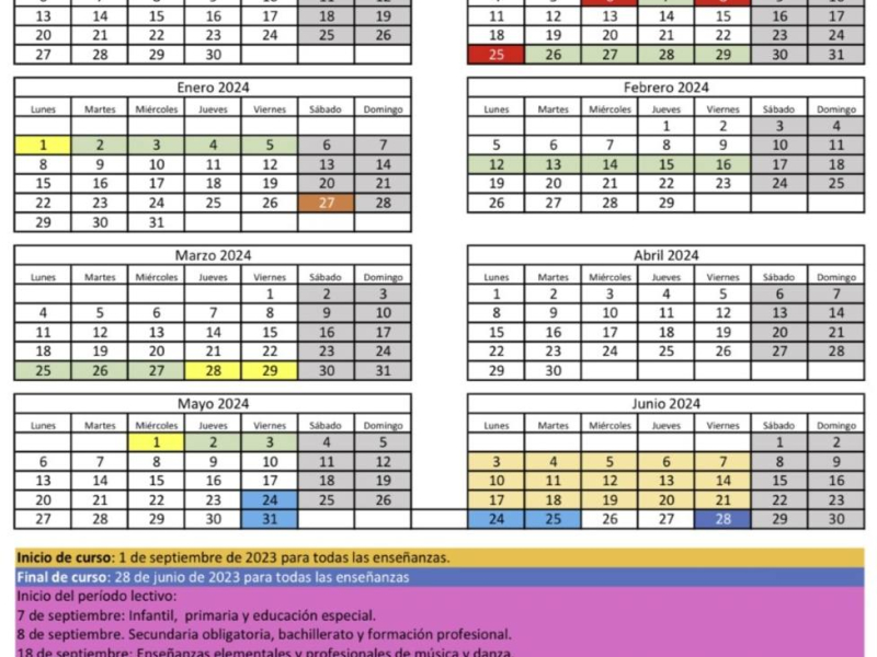 En cuanto al final de los periodos lectivos, en otras enseñanzas se fijan para el 24 de mayo en idiomas, el 31 de mayo en las enseñanzas de música y danza y el 25 de junio en el resto de enseñanzas.