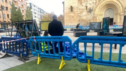 Un operario del montaje de la exposición comenta qué ha ocurrido con la imagen