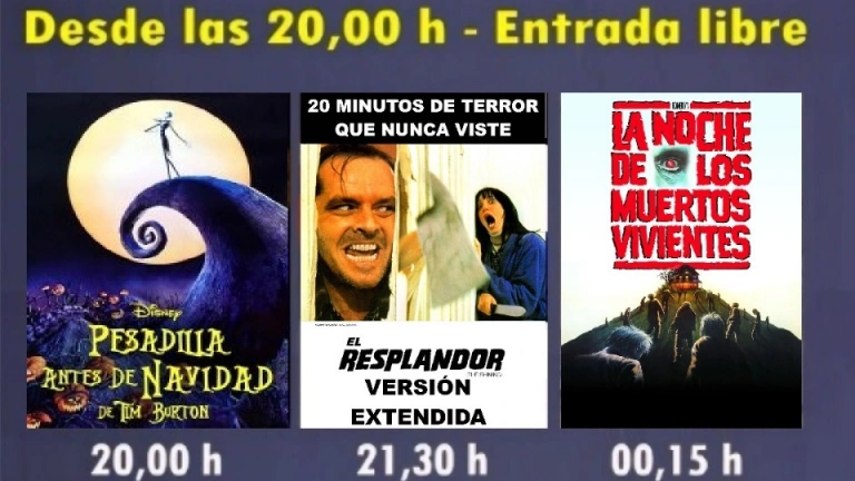 El Autocine de la Filmoteca ofrecerá un maratón con tres títulos emblemáticos. La sesión comenzará a las 20:00 horas con la proyección de Pesadilla antes de Navidad. A las 21:30 horas continuará con la versión extendida de El resplandor, en versión original subtitulada, y el cierre, a las 00:15 horas, correrá a cargo de La noche de los muertos vivientes.