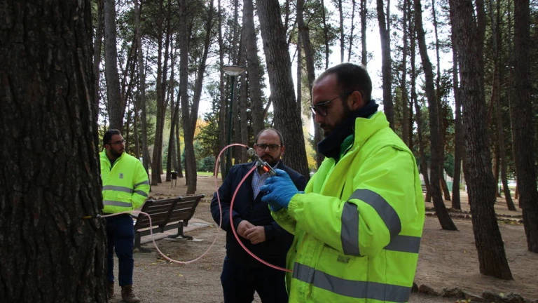 Unos 300 pinos, distribuidos en distintas zonas de Albacete y de las pedanías, ya están recibiendo tratamiento por endoterapia para la prevención de la procesionaria. Se trata de una plaga que afecta a esta especie arbórea y que, en caso de no ser prevenida o erradicada, puede llegar a causar a la desfoliación total de los pinos. Pero este no es el único problema que genera ya que las orugas, en caso de estar en contacto con ellas, pueden provocar urticarias e, incluso, otros efectos más graves en la salud de mascotas y de los niños.