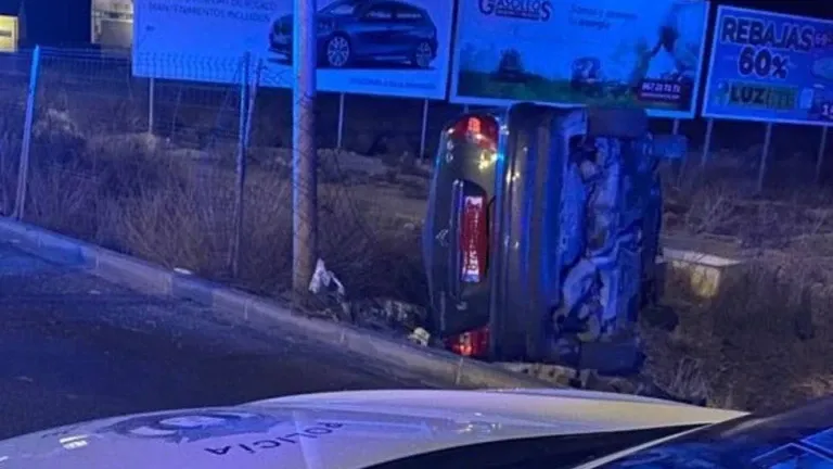 Después de un fin de semana de no pocas actuaciones de la Policía Local, la madrugada del lunes, que parecía tranquila, se ha visto alterada a las 5:45 horas cuando el vehículo que aparece en la imagen (Citroën Xsara) ha volcado en las inmediaciones de la glorieta de acceso al Parque Empresarial de Campollano.