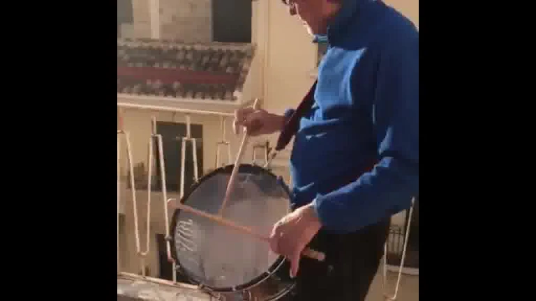 En bata y en la azotea de su casa, la supresión de la Semana Santa no le ha quitado las ganas de tocar