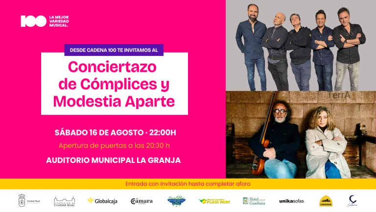Ha llegado el día. Desde hoy, por fin, puedes recoger tus entradas para el conciertazo del verano, el que te trae esta casa, Cadena 100, junto con el Ayuntamiento de Ciudad Real. Será el 16 de agosto, en el Auditorio Municipal de La Granja de Ciudad Real a partir de las diez de la noche. Modestia Aparte y Cómplices serán los encargados de hacer disfrutar a los miles de ciudadrealeños que allí se darán cita en el que será, un año más, el concierto más multitudinario de Ciudad Real. Y para ir ¿qué tienes que hacer? Pasarte por Cadena 100, estamos en el Pasaje San Isidro de Ciudad Real, en el número 3, y recoger de forma totalmente gratuita tu entrada.