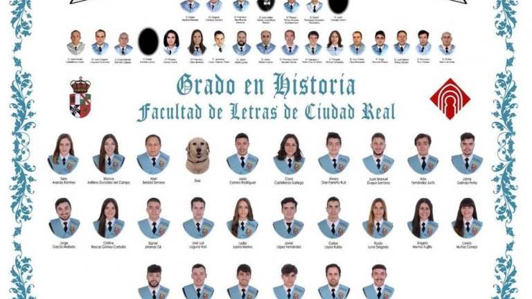 En la orla de la última promoción del grado en Historia de la Universidad de Castilla-La Mancha (UCLM) "sorprende", que entre los bustos de estudiantes con banda azul celeste, destaca el de la perra guía Desi, que ha acompañado a su dueño, Abel Beldad Serrano, en toda una aventura de superación desde que perdió la vista por una enfermedad degenerativa.