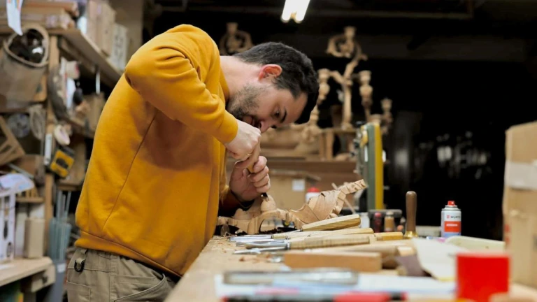 El tallista villarrubiero José Ángel Banegas elabora en su taller respiraderos, pasos enteros, insignias