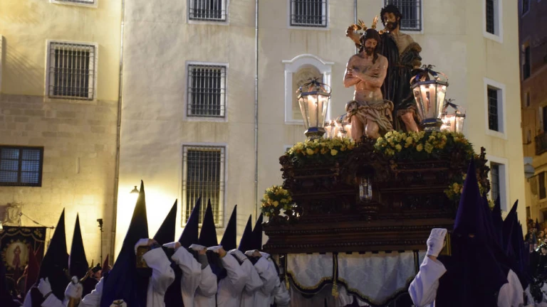 Aún siendo una de las hermandades más recientemente creadas ha aportado desde el primer momento una forma característica de llevar su paso así como el hecho de abanderar la seriedad y rigurosidad como elemento indispensable de su desfile procesional. Abre el desfile el guión de la hermandad confeccionado en color blanco por las Esclavas del Santísimo a pesar de que la hermandad lo había encargado en morado al entender que no se trata de una hermandad de Pasión.