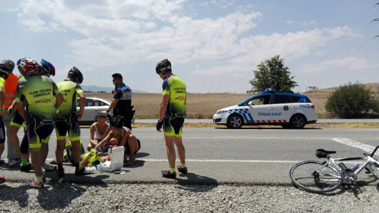 Antonio tiene Suerte, porque 30 minutos tumbado en asfalto, con más 30 grados de temperatura con una brecha en la cabeza se hubieran hecho eternos para él y sus compañeros del Club Ciclista Campillo. Y para redondearlo todo, el Guardia Civil fuera de servicio lleva a su mujer (que va en un autobús junto con familiares de los ciclistas para disfrutar del día) al Hospital de Segovia.