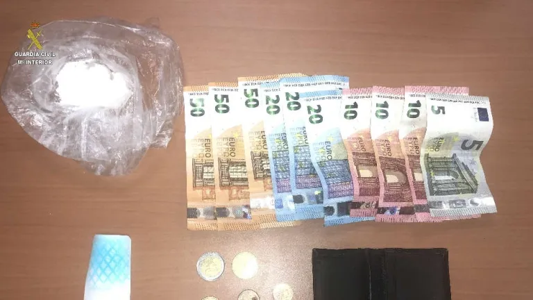 Ante esta situación tan sospechosa, la Guardia Civil procedió a efectuar un registro superficial del vehículo, instante en el que uno de sus ocupantes intentó ocultar un paquete, resultando ser una bolsa transparente con una sustancia polvorienta en su interior, que resultó ser cocaína, arrojando un peso aproximado de 16,5 gramos. Además de la sustancia estupefaciente, estas personas portaban en el interior de una cartera 248 euros fraccionados en billetes de diversa cuantía.