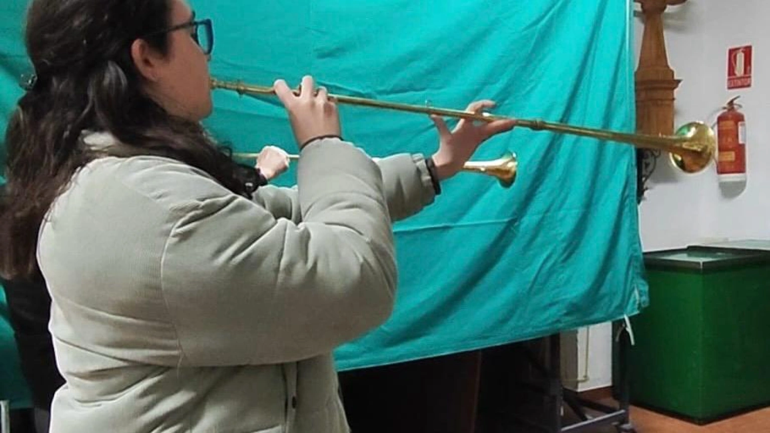 El añafil es un instrumento de viento similar a una trompeta, pero mucho más largo y sin pistones, lo que exige que todo el sonido se module con la boquilla. Esta característica lo convierte en un reto muy duro. "No aguantas una procesión tú sola", confiesa Ainara sobre la dificultad de tocarlo durante un tiempo prolongado.