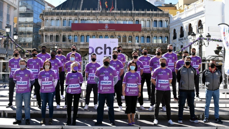 La alcaldesa de Ciudad Real, Pilar Zamora; el presidente del BM Vestas Alarcos, Juan Pablo Marciel, y los concejales de Deportes, Antonio Gallego, e Igualdad, Ana Belén Chacón, han presentado en la Plaza Mayor esta indumentaria con la que el equipo alarquista difundirá los valores, como ciudad igualitaria, de Ciudad Real.