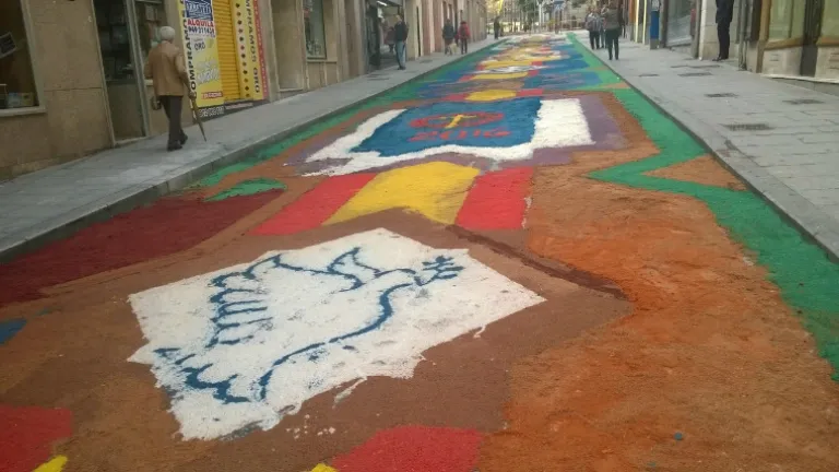La Cofradía de la Pasión del Señor de Guadalajara es la encargada de diseñar y organizar la elaboración de la gran alfombra de 420 metros cuadrados que tapizará el centro de la capital en la festividad del Corpus Christi. En Almonacid de Zorita, son los vecinos los que adornan ocho altares de los barrios del centro de la villa, que quedan unidos por un tapiz de colores de cerca de dos kilómetros de recorrido para servir de base al paso de la Custodia en la procesión del domingo, una Fiesta de Interés Turístico Provincial. Nos lo cuenta la concejal de Turismo almorcileña, Charo Toledano.