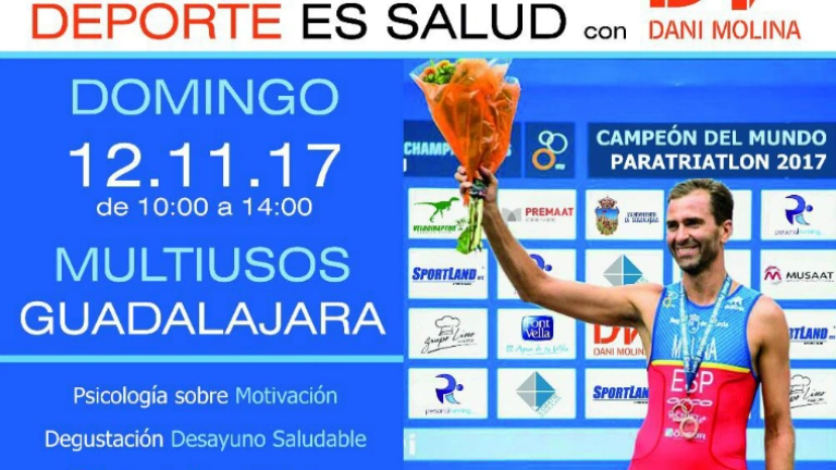 El próximo 12 de noviembre, el Palacio Multiusos de Guadalajara acogerá la "Jornada No Competitiva Familiar", organizada por el triatleta paralímpico Dani Molina. Bajo el eslogan "Deporte es Salud", la cita arranca a las 10:00 una charla motivacional a cargo del propio Molina y continuará con la degustación de un desayuno saludable a cargo del Grupo Lino y sesiones prácticas de diferentes modalidades deportivas, como Pilates, Ciclo Indoor, Zumba, Body Balance y Body Pump.