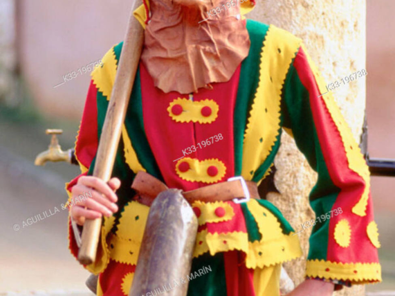 Con el rostro cubierto por una máscara, desde 1995 realizada en cuero, ataviada con un llamativo traje de colores amarillo, rojo y verde, calzada con abarcas de labriego, pertrechada con varios cencerros colgados a la cintura y "armada" con una porra, la primera botarga del año en nuestra provincia protagoniza, un año más, una Fiesta de Interés Turístico Provincial.
