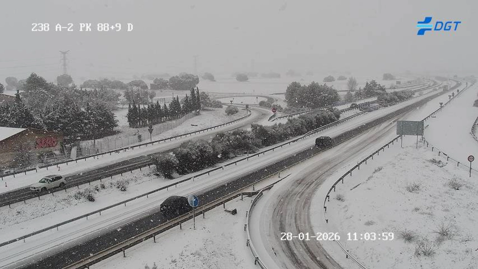 Las nevadas obligan a restringir el paso de camiones en la A-2 y otras vías de la región, que acumula más de 80 incidentes en solo dos horas