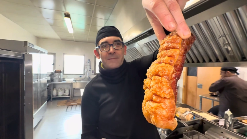 Benja, cocinero: "El torrezno se confita a 130 °C durante 50 minutos, se enfría y se hornea a 230 °C 20-25 minutos; cada 25 minutos salen 64 piezas y no se añade grasa extra"