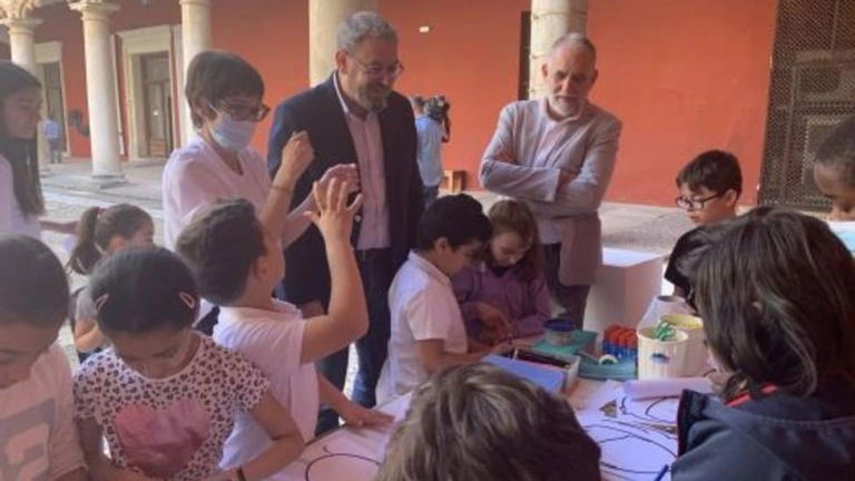 Eusebio Robles, junto con el delegado provincial de Educación, Cultura y Deportes, Ángel Fernández Montes y el director del Museo provincial de Guadalajara, Fernando Aguado han acompañado al alumnado de 2º de Primaria del Centro de Educación Infantil y Primaria Alcarria de Guadalajara en su participación en la primera de las actividades que el Museo provincial de Guadalajara ha programado a lo largo de la semana para conmemorar esta efeméride.