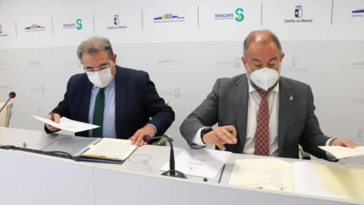 Toledo, 3 de abril de 2023.– El consejero de Sanidad, Jesús Fernández Sanz, y el rector la Universidad de Castilla–La Mancha, José Julián Garde, han suscrito hoy el protocolo de colaboración para la cesión de espacios docentes en el Hospital Universitario de Toledo para los estudiantes de las Facultades de Medicina de Albacete y Ciudad Real que cursarán sus estudios a partir del curso 2023–2024.