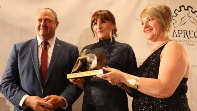 En nombre del presidente García–Page y del resto del Gobierno autonómico, el consejero ha dado la enhorabuena a María Rozalén, Cuchillera del año 2023 en reconocimiento a la difusión de la navaja en su canción ‘Es Albacete’, y también por su labor “como la embajadora que hoy tiene Albacete” y de la Cuchillería. Este galardón lo ha entregado el consejero junto a la presidenta de APRECU.