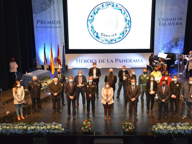 De manera extraordinaria se reconoció a los héroes y heroínas talaveranos que han luchado en primera línea contra la pandemia: empresarios, afectados por Covid-19, sanitarios y no sanitarios, Policía Local, Protección Civil, GEACAM, Fuerzas y Cuerpos de Seguridad del Estado, Bomberos, comerciantes, farmacia, transportes, entidades sociales; entre otros, en representación de toda la sociedad talaverana.