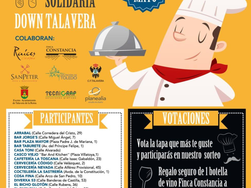 La asociación de personas con Síndrome de Down y otras discapacidades intelectuales, familiares y profesionales de Talavera de la Reina y provincia,Down Talavera,organizasu primer concurso de tapa gourmet solidarialos días 13, 14, 15 y 16 de mayo.