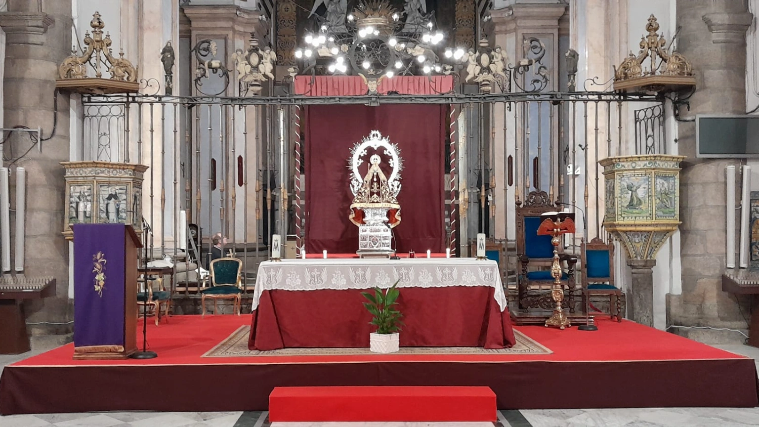 Para las celebraciones litúrgicas, se ha instalado una tarima y un presbiterio provisional delante de la verja, en la zona del antiguo crucero. Esta disposición, según Díaz Guerra, recupera en cierto modo la forma que tenía la ermita de la Virgen del Prado en el siglo XVI, antes de la gran ampliación del siglo XVII. "Tiene su encanto", afirma, además de hacer las misas "mucho más visibles para todos los fieles" al eliminar el obstáculo de las columnas.