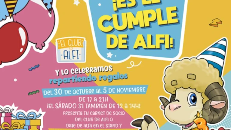 Alfi, el carnero mascota de Los Alfares cumpleaños y lo celebrará con regalos para sus amigos los días 1 y 2 de octubre. De 17:00 a 21:00 todos los socios del Club de Alfi que visiten el centro comercial podrán felicitar a la mascota de Los Alfares y llevarse de regalo un peluche, un cómic con las aventuras de Alfi y un obsequio dulce. Alfi estará acompañado de las payasas Chispa y Chispita, que animarán a los niños con sus bailes y canciones.