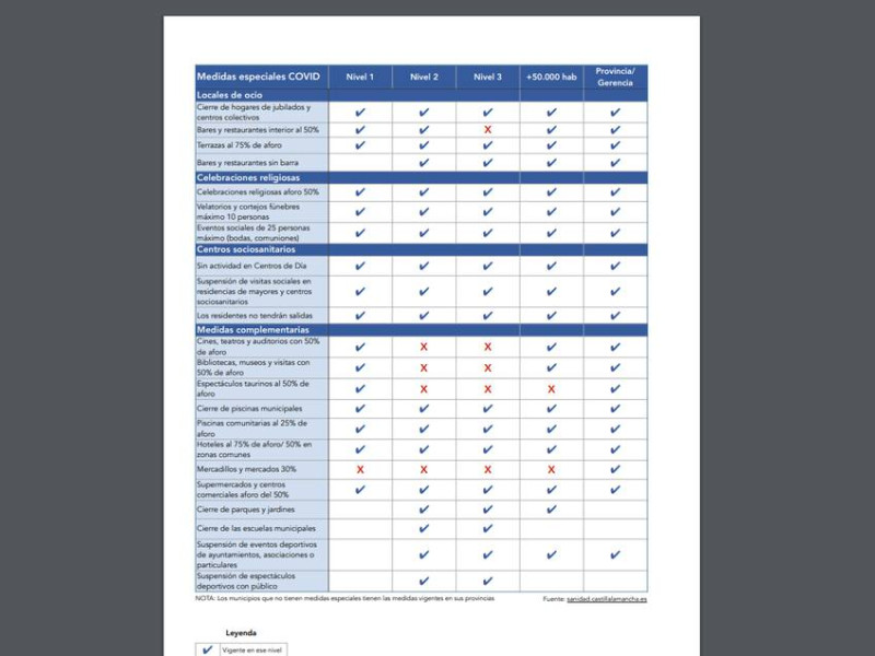Las medidas que se están aplicando, hasta el momento, son las que dicta la Consejería de Sanidad de la Junta de Castilla-La Mancha. En esas medidas, y tal como puedes consultar en el GRÁFICO que verás a continuación, aparecen varios niveles de restricciones: