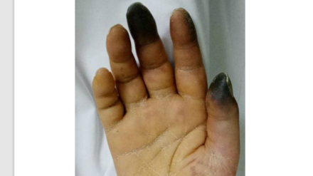 Mano derecha de un paciente con fracaso multiorgánico grave y necrosis irreversible, con gangrena de pulgar Redacción Digital