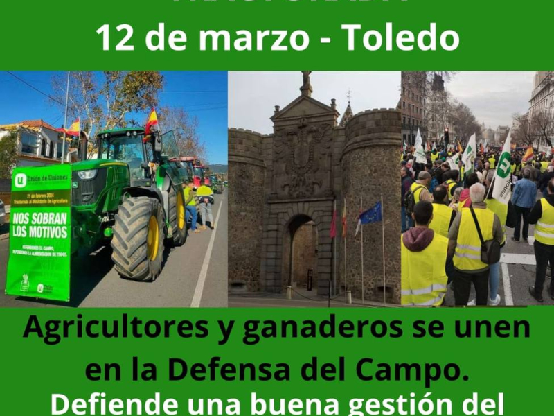 Dos días antes, el próximo martes día 12 de marzo, Unión de Uniones Castilla la Mancha, llevará a cabo otra movilización en Toledo. Los tractores se concentrarán a las 09.00 horas en la Consejería de Desarrollo Sostenible. Los autobuses y manifestantes se concentrarán de igual manera a las 11.00 horas desde el Aparcamiento en el Barrio de Santa Teresa para arrancar la manifestación a pie.