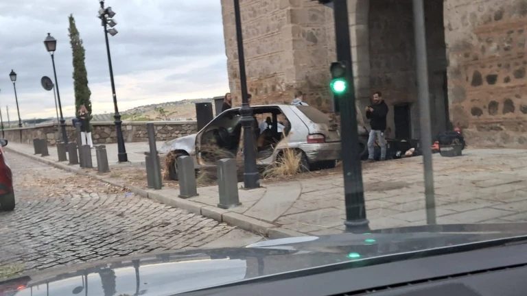 De nuevo la ciudad de Toledo es escenario para el rodaje de una película. En este caso, en el puente de Alcántara y parte del aparcamiento de Azarquiel. A la salida del puente, como puedes ver en las imágenes, a un lado y otro de la vía se han colocado dos coches accidentados.