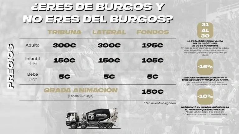 Además, cada nuevo abonado que efectúe una nueva alta, venga o no acompañado, tendrá a su disposición un vale del 10% de descuento en todos los productos oficiales de merchandising del Burgos Club de Fútbol.