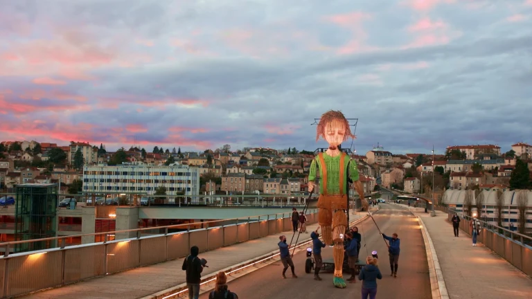 Se trata de una marioneta gigante llegada desde Francia. Se llama 'Mo y la cinta roja', tiene más de siete metros de altura y cuenta la historia de un niño que huye de su país en guerra