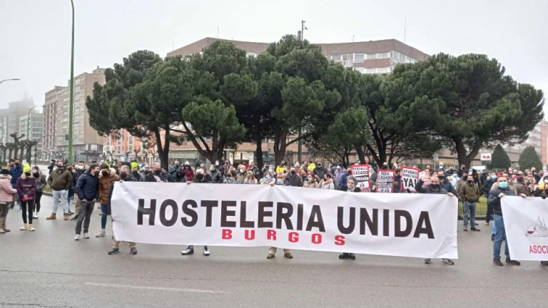 Cientos de hosteleros se concentraron hoy en Burgos para exigir las prometidas ayudas de la Junta de Castilla y León al sector, así como para manifestar su “mayor indignación y repulsa” por la actuación del Gobierno central y autonómico, en relación con las modificaciones del estado de alarma ya que, en su opinión, “lo único para lo que sirven es para ahondar en la herida de los daños que padecen”.