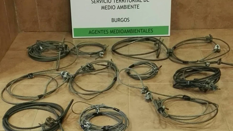 Agentes del Servicio Territorial de Medio Ambiente de la Junta de Castilla y León en Burgos localizaron 14 lazos de acero colocados en sendas, junto a unas bañas de jabalí, en la comarca de Sabinares de Arlanza.