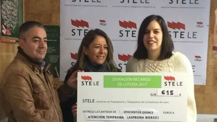 El Sindicato de Trabajadores y Trabajadoras de la Enseñanza STELE ha hecho entrega en la Sede del Bierzo, del dinero recaudado con la venta de la lotería de Navidad 2017, alcanzando un total de 615 Euros. Esta cantidad corresponde al recargo incluido en las participaciones y que, como sucede cada año, el sindicato después destina a un fin social relacionado con la Educación. En este caso, se donó a Atención Temprana (Asprona Bierzo).