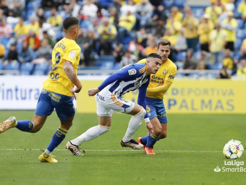 Las Palmas tampoco imprimió la velocidad de balón adecuada para aprovechar la debilidad visitante y no dispuso de más ocasiones en un primer tiempo en el que solo tuvo que volver a intervenir Valles para despejar un centro-chut de Naim en el minuto 36.