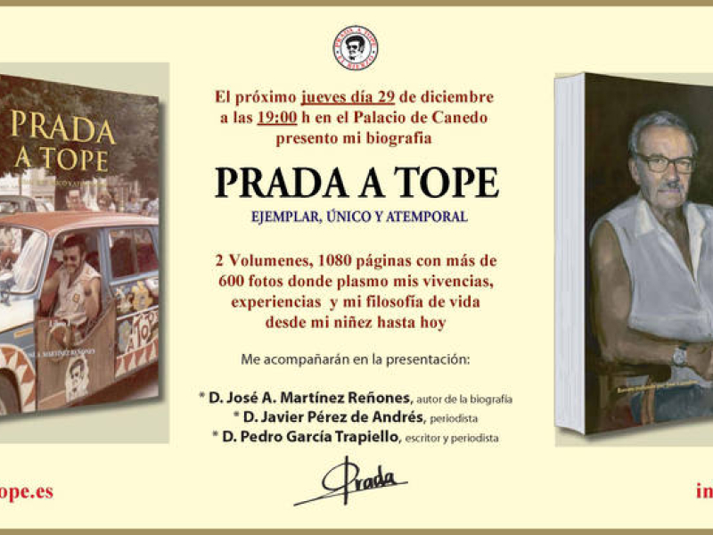 Este jueves 29 de diciembre, a las 19 horas en la bodega del Palacio de Canedo, José Luis Prada ‘Prada a Tope’ presentará en un acto abierto al público su libro biográfico, a caballo entre unas memorias al uso y un repaso a toda una época de la historia reciente del Bierzo. La presentación estará dirigida por los periodistas Pedro Trapiello y Javier Pérez Andrés, a los que acompañará el autor, José Antonio Martínez Reñones, y el propio Prada.
