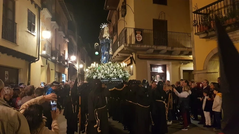 La imagen de la próxima Semana Santa es obra del fotógrafo Quinito. Se trata de una composición en blanco y negro de gran fuerza que combina patrimonio, religiosidad y emoción. En el eje central, un paso de Jesús Nazareno avanza ante la silueta del Castillo de los Templarios, mientras que en primer plano, desenfocado, se distingue el rostro del Lambrión Chupacandiles.