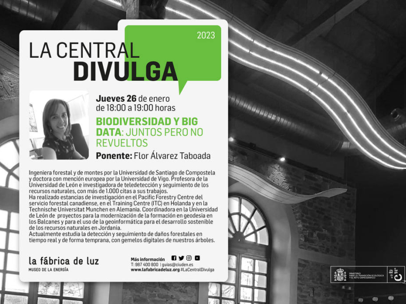 Este jueves 26 dará comienzo una nueva edición del ciclo de divulgación científica ‘La Central divulga’ del Museo de la Energía de Ponferrada. La sesión inaugural estará a cargo de Flor Álvarez, profesora e investigadora de la Universidad de León en el Campus de Ponferrada. ‘Biodiversidad y big data: juntos pero no revueltos’ es el título de la charla con la que Flor Álvarez expondrá cómo la aplicación del big data contribuye al estado actual de la diversidad, qué datos son válidos y cuáles son las plataformas más adecuadas para realizar un seguimiento y gestión de la biodiversidad. La sesión tendrá lugar a las 18:00 horas en el restaurante-cafetería La Central y la entrada es gratuita y libre hasta completar aforo.