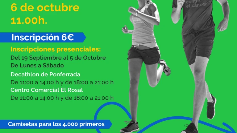 La inscripción, que tiene un precio de 6 euros y puede hacerse presencialmente de lunes a sábado desde ya y hasta el 5 de octubre en los puntos oficiales que son el Decathlon de Ponferrada y en el Centro Comercial El Rosal de la capital berciana en horario de 11:00 a 14:00 y de 18:00 a 21:00 horas y el mismo domingo 6 de octubre en el punto de salida de 9:00 a 13:00 horas. Los primeros 4.000 inscritos se llevarán una camiseta de la Asociación Española Contra el Cáncer.