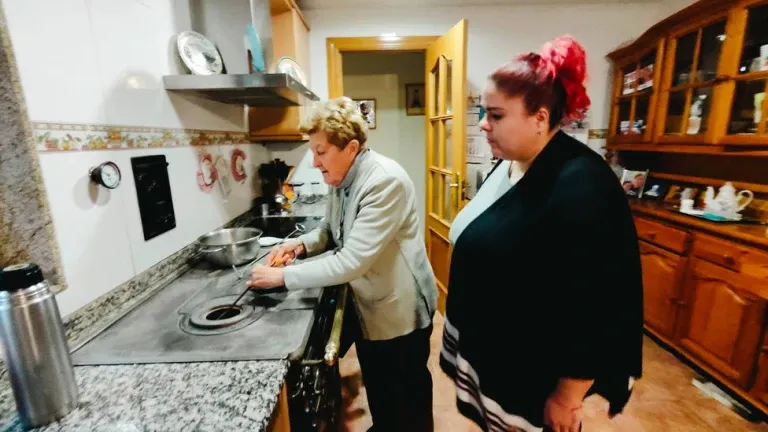 Y así nos encontramos a Ángeles sentada en el sofá de su cocina, con un puñado de pimientos secos en su regazo y armada con un cuchillo, preparándolos para hacer pimentón casero con su prima. A su lado está Melanie, su asistente personal. “Yo dependo cada día de lo que ella quiera hacer. Si quiere ir a hacer compras, si tiene que ir al médico, si hay que hacer algo en casa o si le apetece salir a tomar un café. Con cada persona es diferente. Con una sólo hago ejercicios cognitivos, otras necesitan ayuda para levantarse, otras para acostarse…”, cuenta.