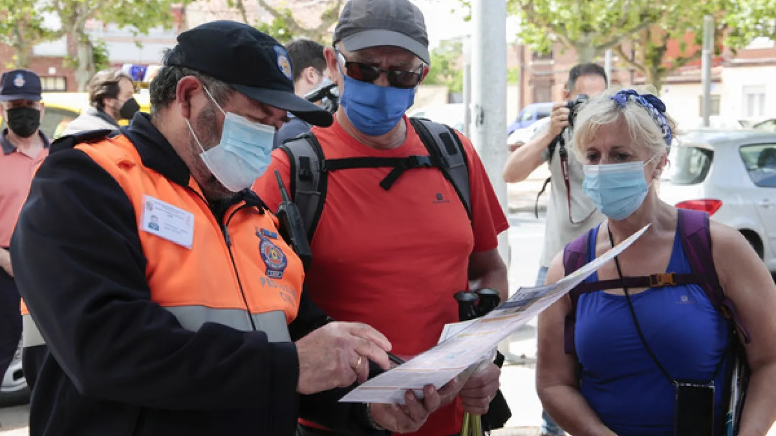 Además, los voluntarios de Protección Civil proporcionan a los peregrinos planos de la ciudad en los que se encuentra marcado el Camino de Santiago, al tiempo que disponen de mascarillas y gel hidroalcóholico para quien lo precise.